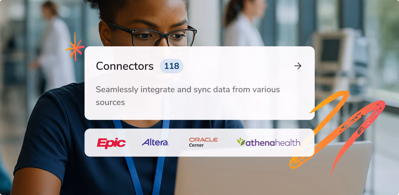 Connectors for major systems including Epic, Oracle Cerner, MEDITECH, Allscripts, and athenahealth including FHIR API compatibility.
